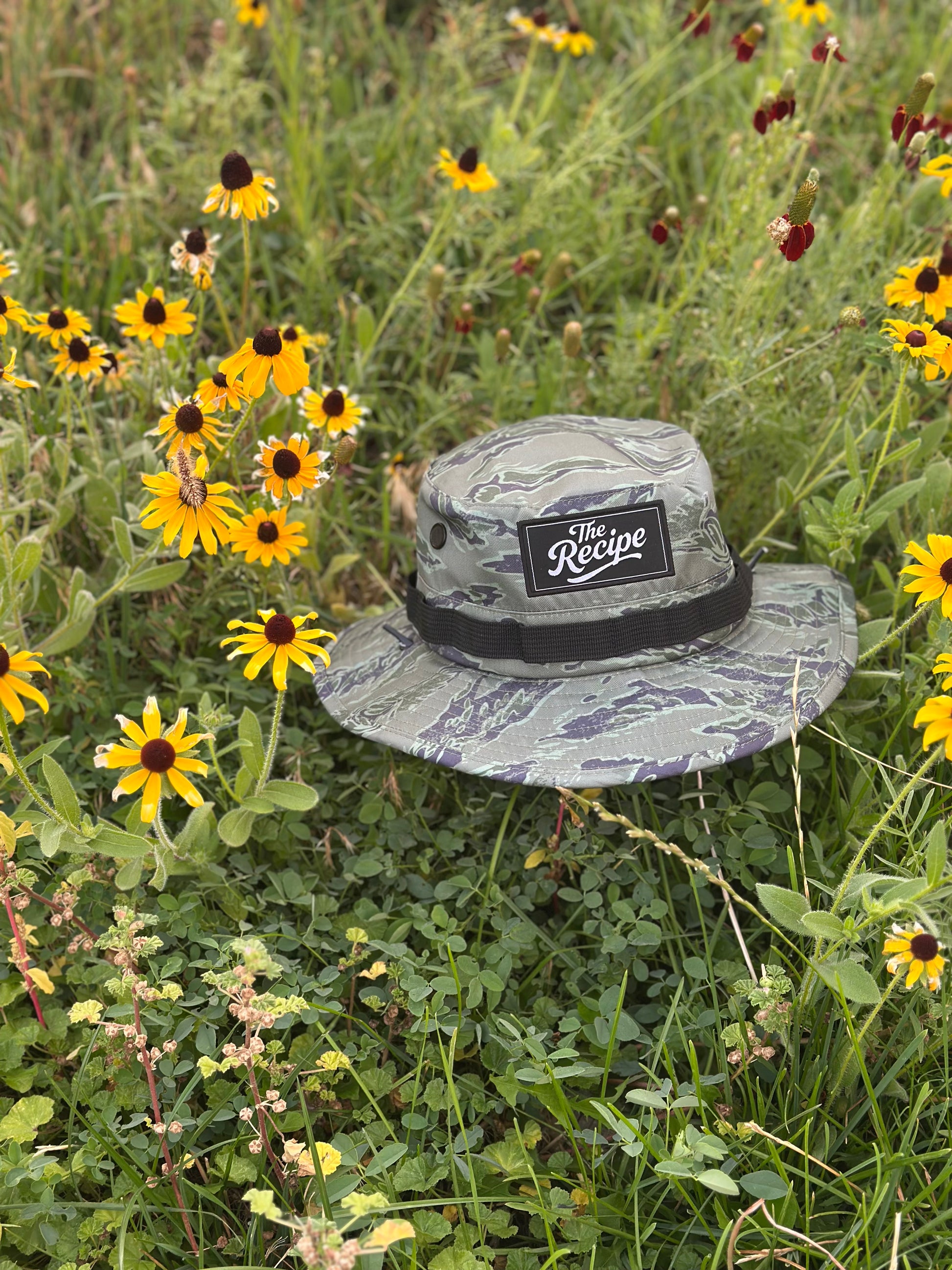 Camo bucket hat with a woven Recipe patch logo. Drawstring to allow for adjustability on the windy days.